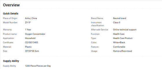 | ความเข้มข้นของออกซิเจน: | 93% ±3% (1-10L/นาที) | ||